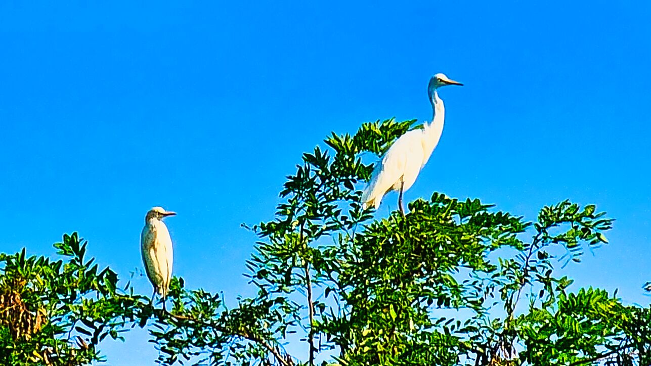 저수지 옆 나무에 앉아 쉬고 있는 백로?