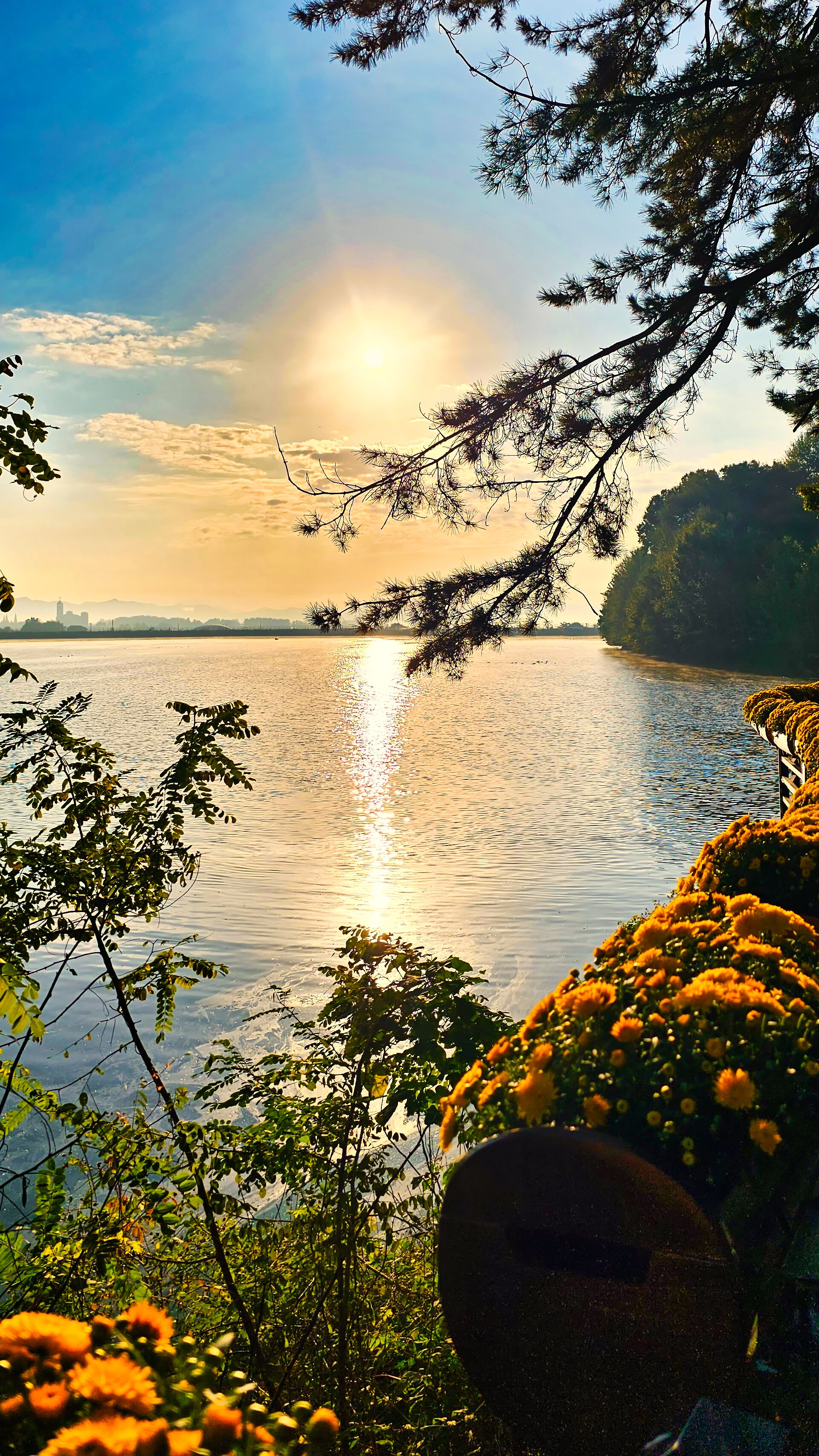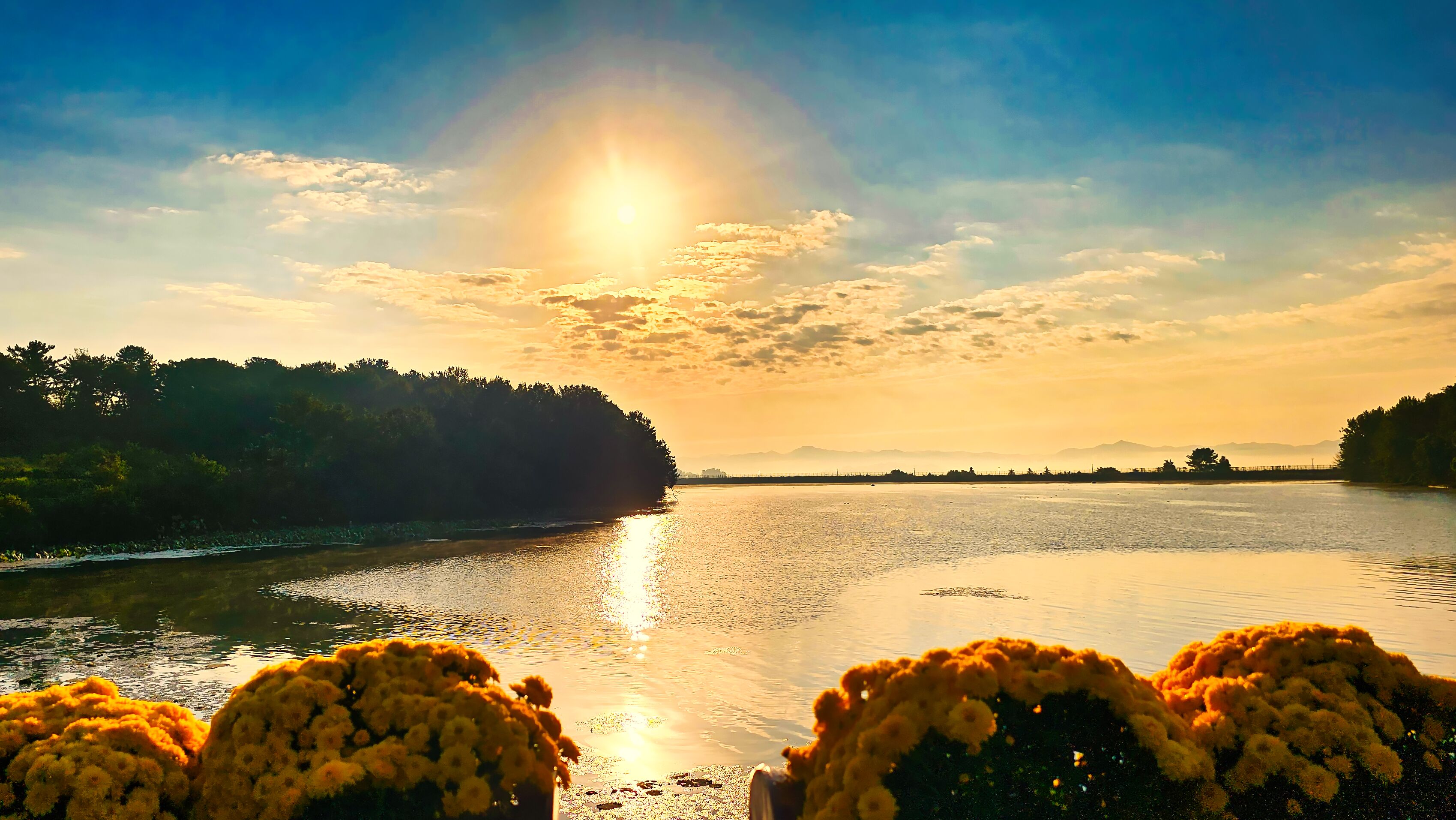 신흥저수지위로 해가 떠 오른다.